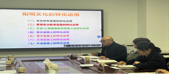 许晓璐介绍了公司“六元文化”的由来、内涵及具体做法,并把公司在实施“六元文化”协同育人共建大思政格局工作方面的亮点作了梳理和简单的介绍。何志玉从“马院+书院”定位、载体、课程建设共同体、育人协作共同体构建等四个方面作了介绍,强调“马院+书院”的协同育人模式一定要结合自身特色落到实处,通过教学共同体、学术共同体和社会资源共同体的架构,实现全课程体系建设和大中小思政课一体化建设的贯通,真正把立德树人根本任务落实、落细。任健从七个方面介绍了阳明学与黔学研究院在“马院+书院”协同育人方面的典型做法。从“阳明心乐坊”、“理论二人讲”到诗词朗诵阳明先生“教条示龙场诸生”都体现了对阳明文化的创造性转化和创新性发展。