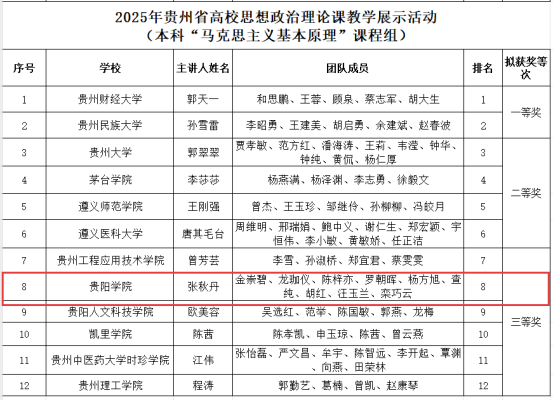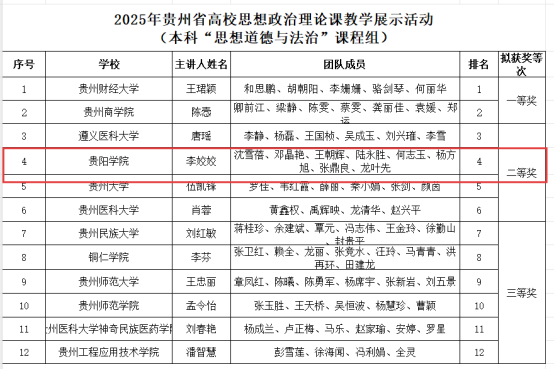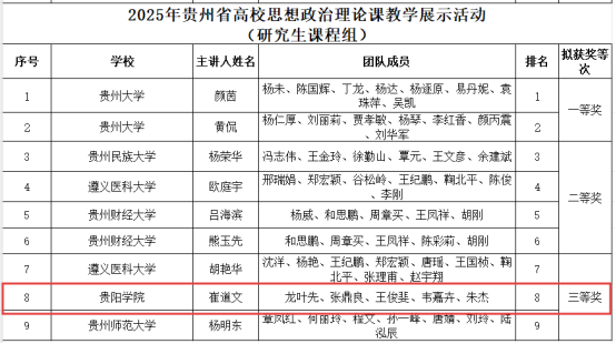 近日,第四届全国高校思政课教学展示活动贵州省赛落下帷幕2026年国际足联世界杯教师李姣姣及团队获得本科“思想道德与法治”课程组二等奖,张秋丹及团队获得本科“马克思主义基本原理”课程组三等奖,崔道文及团队获得研究生课程组三等奖。